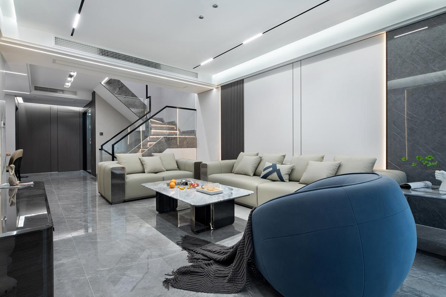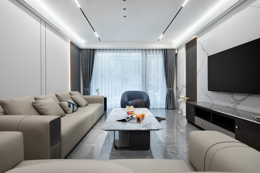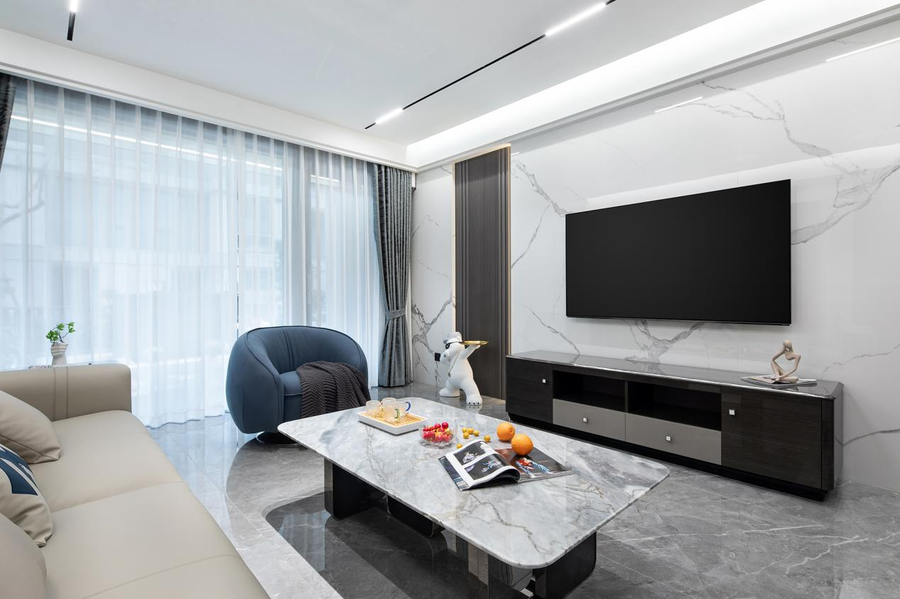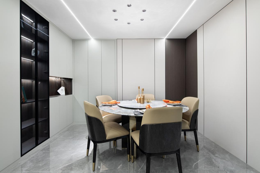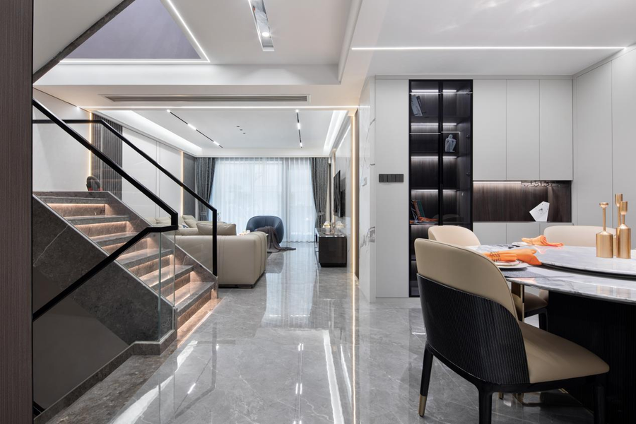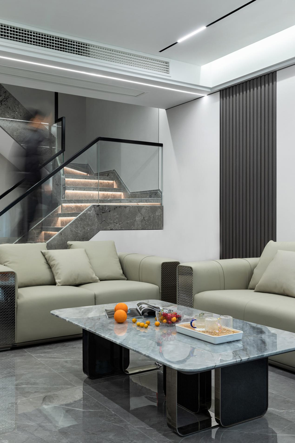 客厅是以黑白色和高级灰色为主色调,瓷面的地板与大理石的茶几交相呼应,再搭配着白色线性吊顶灯,使大理石反射出明镜般的光泽,看起来干净、简单又高级。客厅区域金属使用广泛,将现代的尊贵优雅之美表达得更加纯粹。