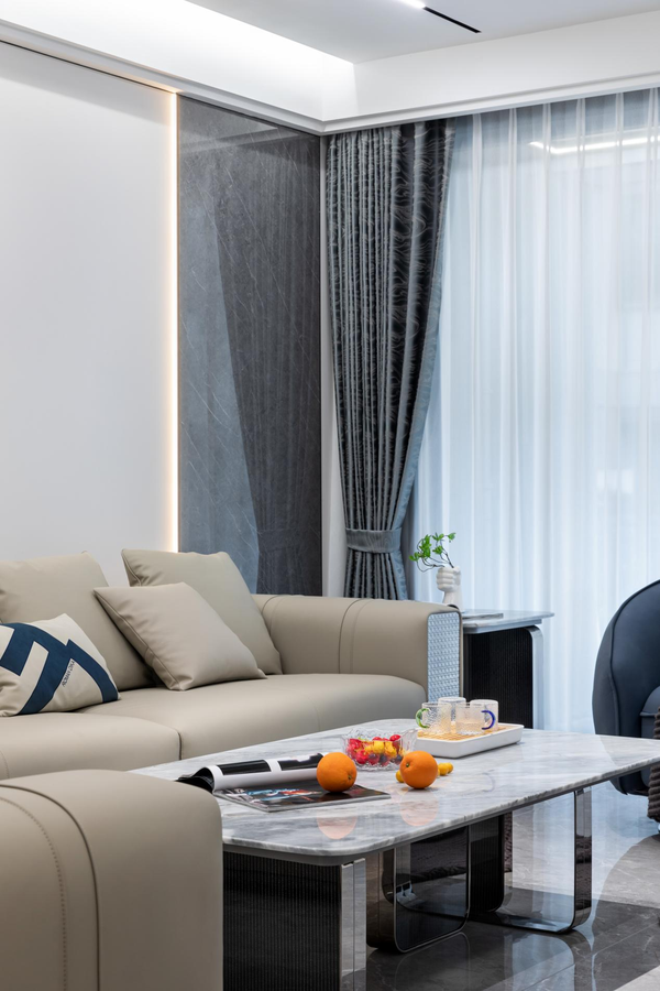 窗帘为深灰色系,通过纱帘与窗帘的双层组合,可以巧妙控制家居环境的氛围,透过纱帘的阳光,不会太过刺眼,自然柔和。