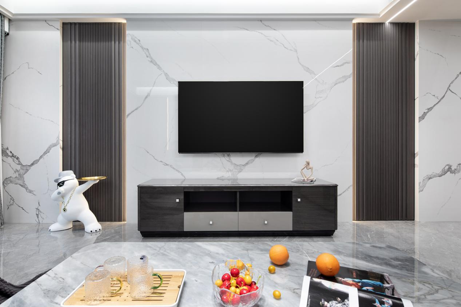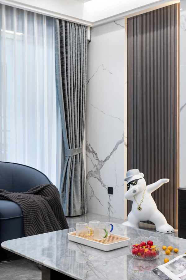 电视背景墙采用岩板和格栅的搭配,完美诠释了视觉层次感,既不拥挤也不杂乱。电视柜旁放置的白熊摆件,手举镶金置物盘,姿势活泼可爱。