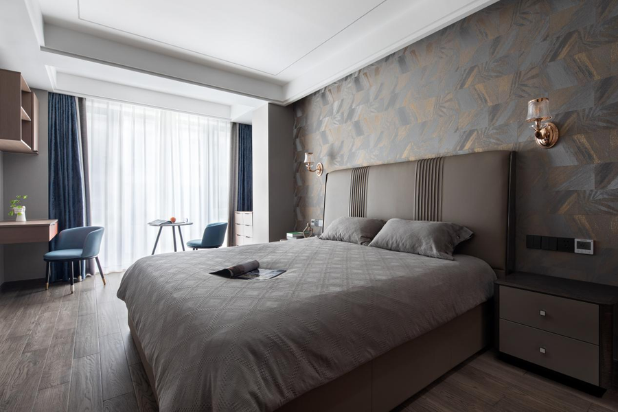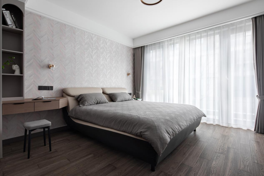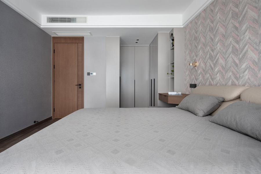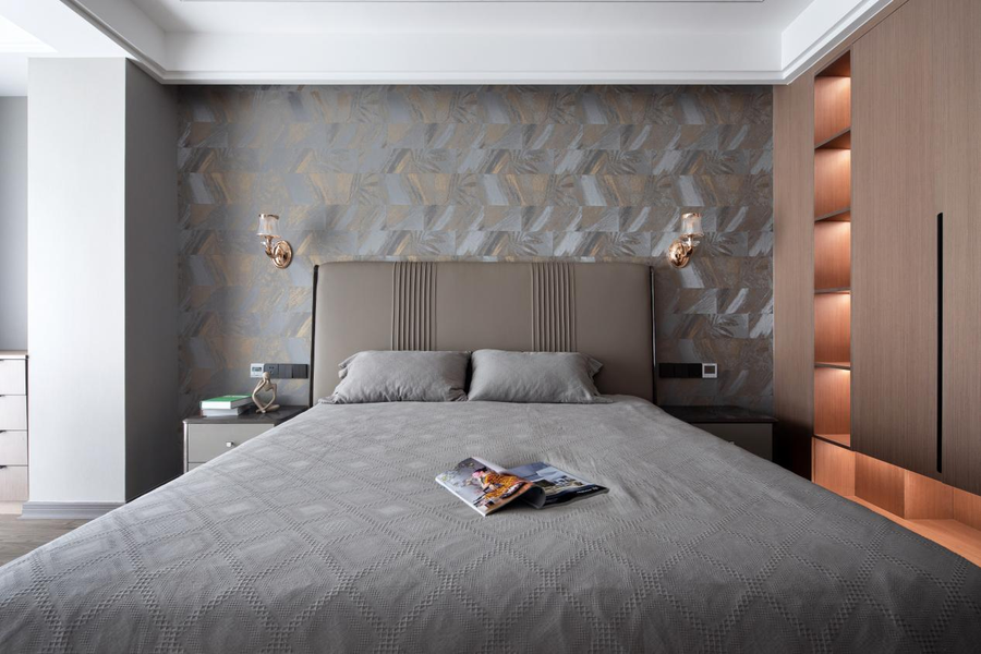 设计感极强的混色壁纸,轻奢耐看,时髦感呼之欲出。淡雅的床品搭配、精致的饰品点缀,瞬间打破了中性色调的沉闷感,使色彩层次丰富化,整体低饱和度的配色,柔和且宁静。