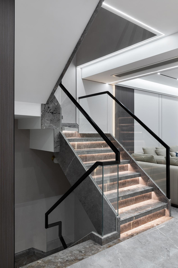楼梯采用玻璃作为扶手支撑,两侧扶手用黑色金属框架包裹,简单又醒目。台阶下口都安装了暖黄色长条灯具,大理石和射灯的相互结合,增加了楼梯的艺术情调。