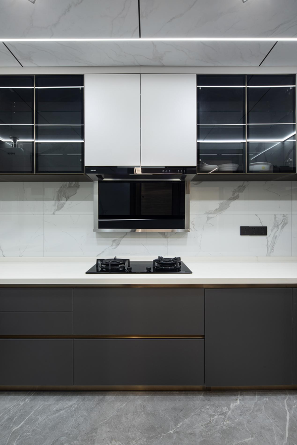 黑白调的厨房空间开阔大气,L型操作台面布局动线流畅,洗碗柜龙头弧形元素的加入,与圆环形的厨灶彼此呼应,巧妙柔和了直线棱角,为家注入温度感和艺术气韵。