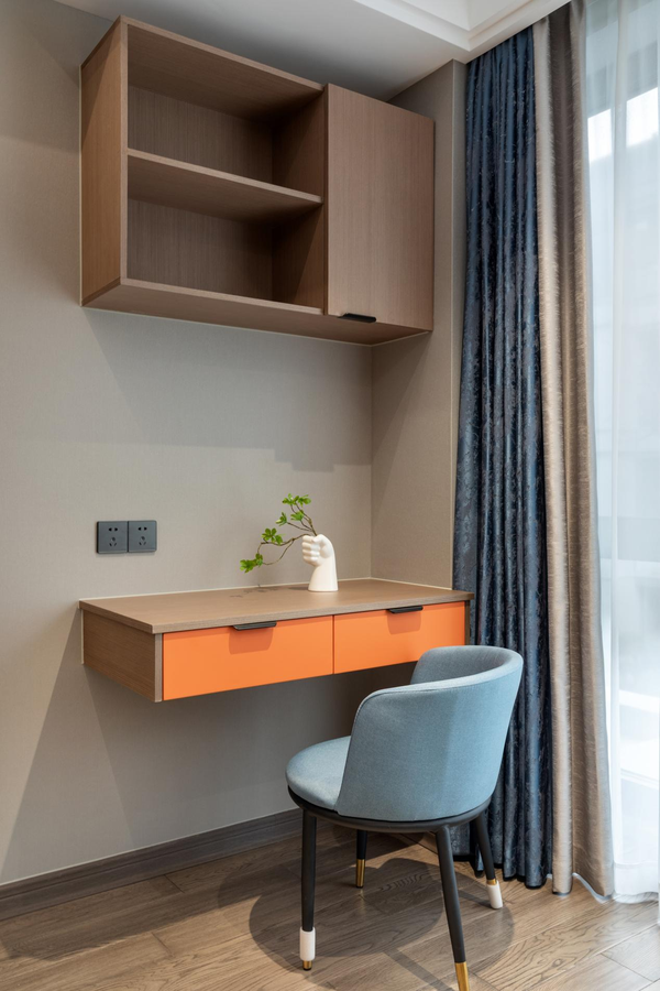 爱马仕橙书桌和雾霾蓝椅子相互搭配,让卧室散发着活力、个性的独特魅力。