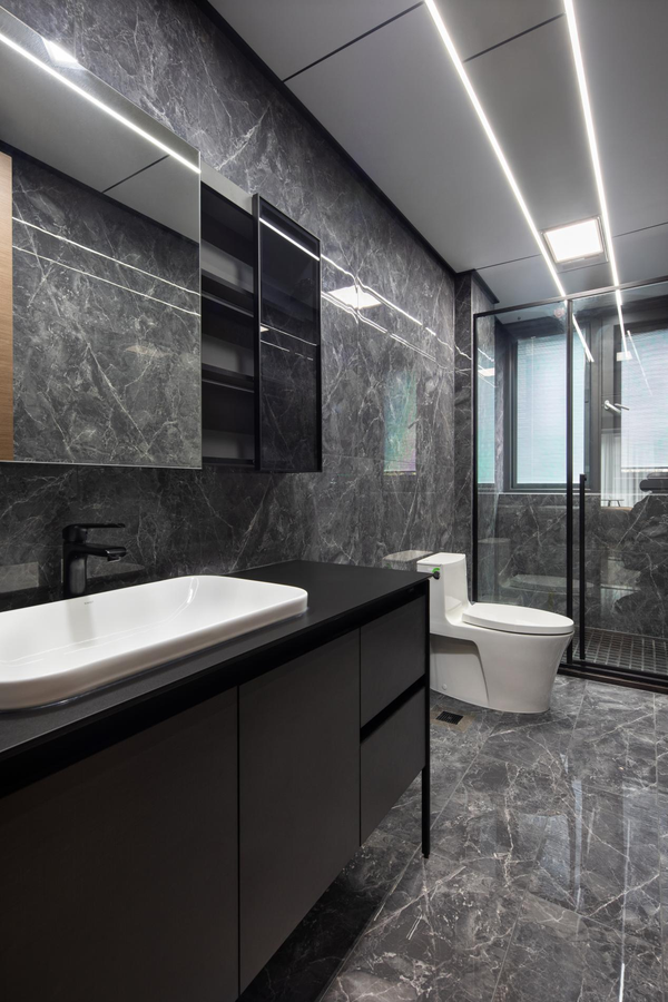 卫生间整体是深色系,干湿分离设计,设计选用玻璃淋浴房,通透开阔。台下盆方便擦拭溅水。为了保证有更大的收纳空间,设计师改造成镜柜,自带隔板更方便。