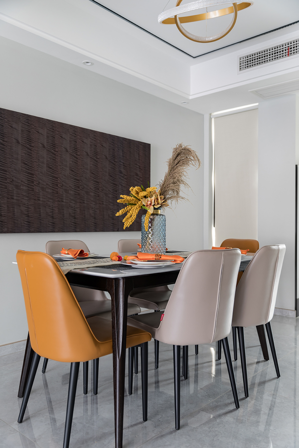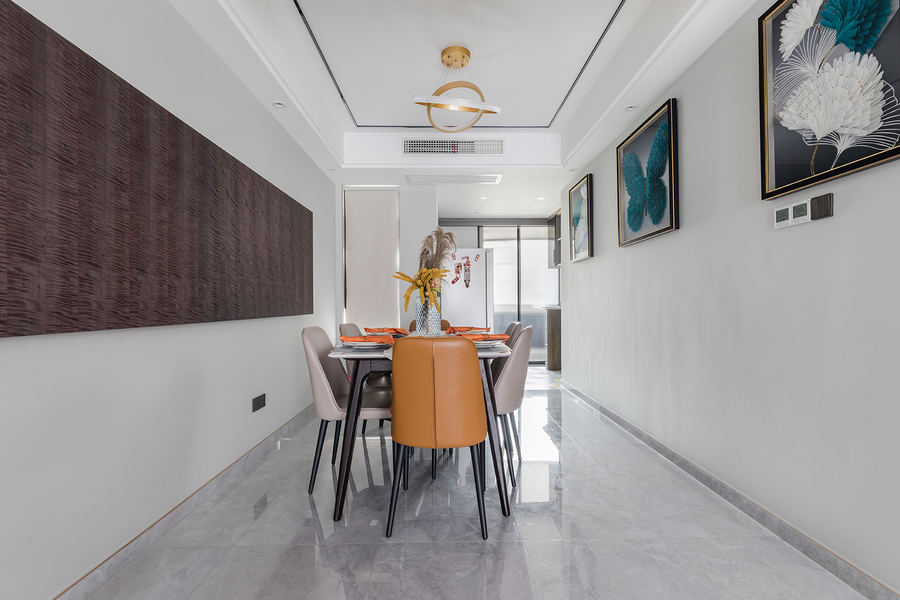 客餐厅一体化,与客厅的设计相得益彰,环形吊灯时尚大气,橙色皮质餐椅与杏色结合干净且兼具时尚感。
