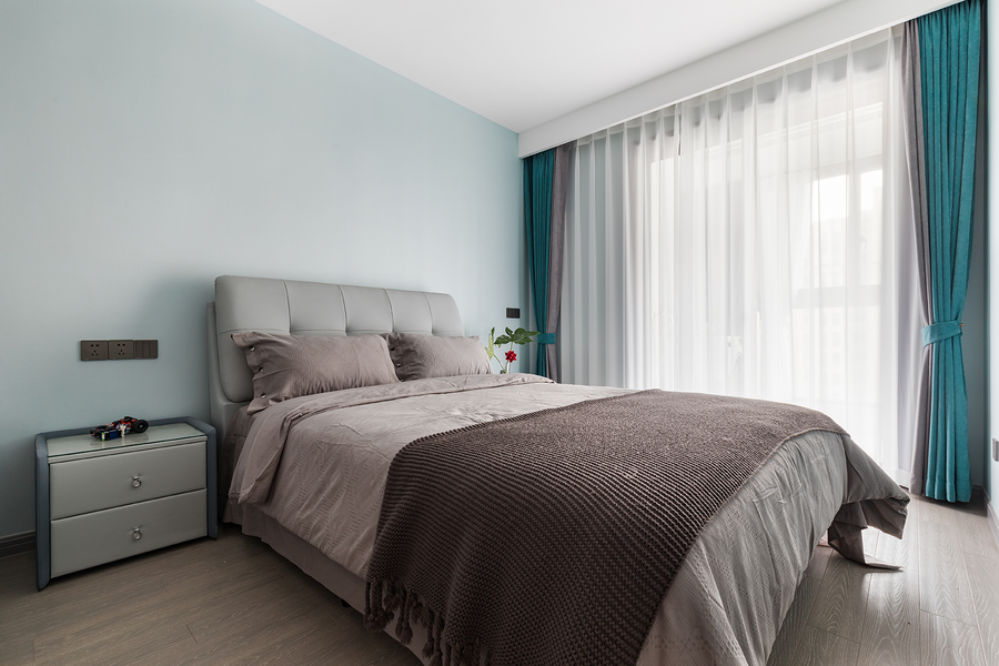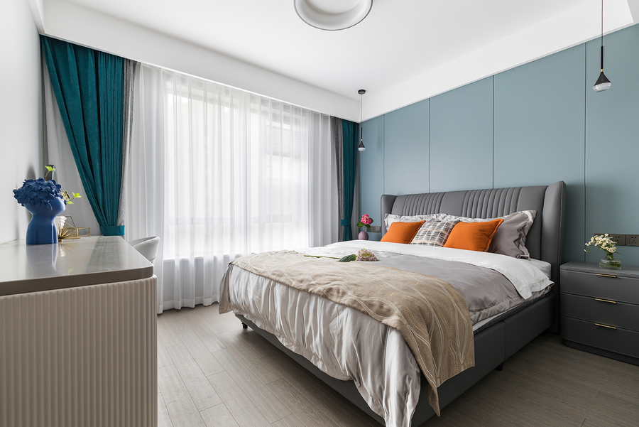卧室明亮通透,莫兰迪蓝色做为背景墙主色调,原木色地板铺设,整体舒适大气,软装以高级灰为主,质地柔软,轻松打造简约却放松的睡眠空间。
