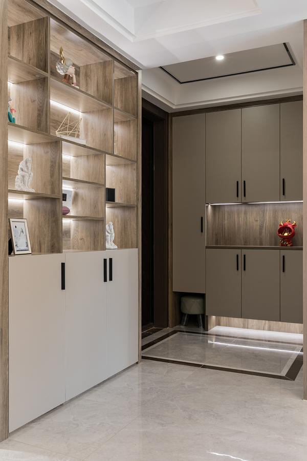 玄关采用了复合型柜体设计,多格储物柜,鞋柜与储物柜一体,视觉上毫无撕裂感,整体开阔明亮,玄关柜底部加了感应灯带,这样进门就不用再面对黑漆漆的屋子啦。