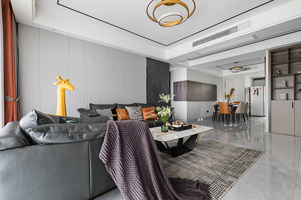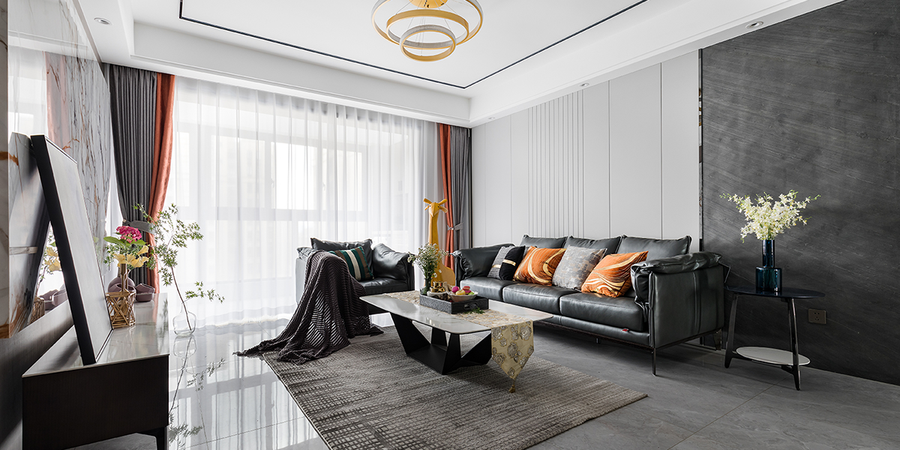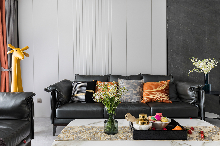 水泥灰墙壁与黑色软皮沙发相搭配,营造出高级极简的现代风味,橙黄色抱枕点缀整体色调,独特的刺绣设计与精致的摆件为整体空间带来几分轻奢感,简而不凡。
