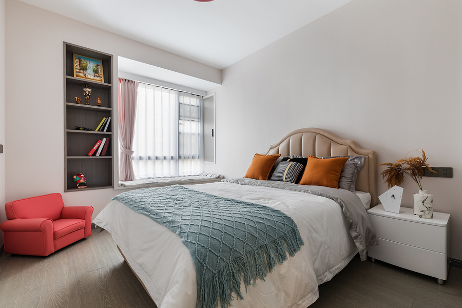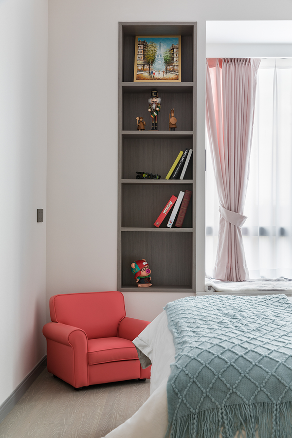储物柜与飘窗做了一体化设计,不占用空间,收纳利用率高,角落里单人沙发一抹草莓红为房间增添了几分俏皮有趣。