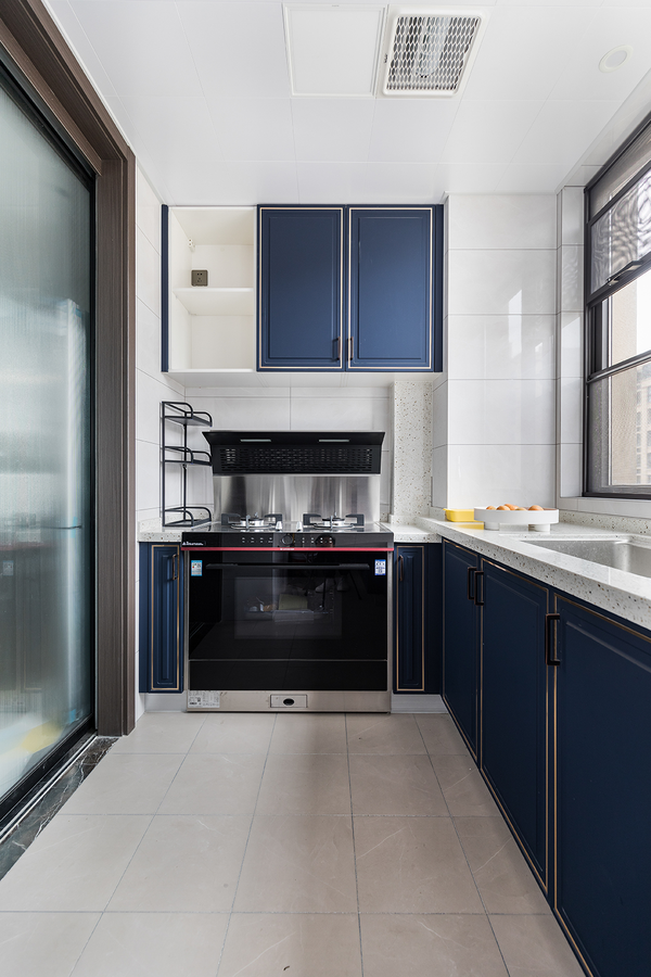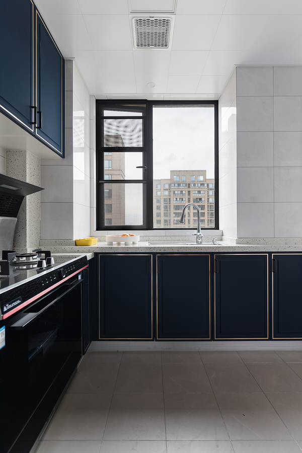厨房还算宽敞,所以选择了L型布局,分区清晰,深浅色调在厨房自然分开吊柜和地柜,非常有层次感。