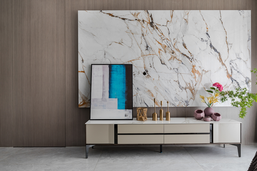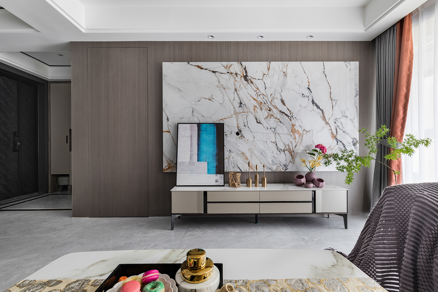 一整面的木饰面墙代替了白色的单调,电视机背景墙大理石纹与木饰面结合,一冷一暖,一柔一刚。