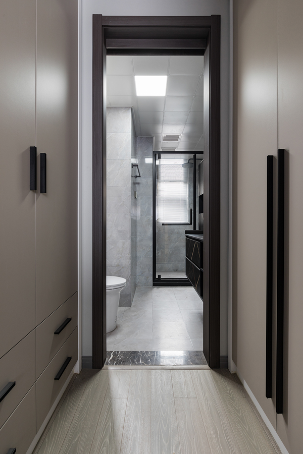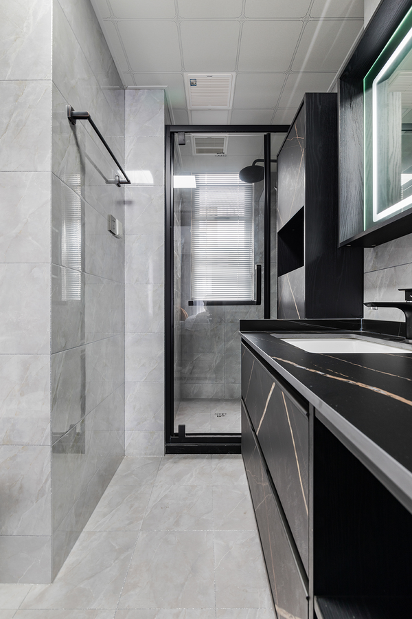 洗手间选用的都是哑光的防滑瓷砖,黑白系时尚前卫,整体保持简约时尚的格调,线条凝练有型,方寸间独具现代摩登质感。