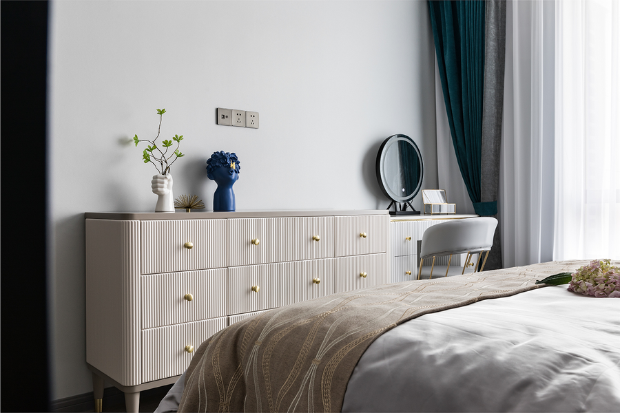 卧室的面积较宽,梳妆台与储物柜尽显精致温柔风,植物摆件抽象有趣,为室内增添一丝灵动与生机。