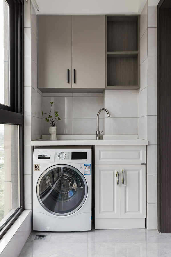 顶天立地的白色储物柜使用能装,承包了阳台区域的收纳需求,底部预留空间,嵌进了洗衣机,赋予了生活更多便利。