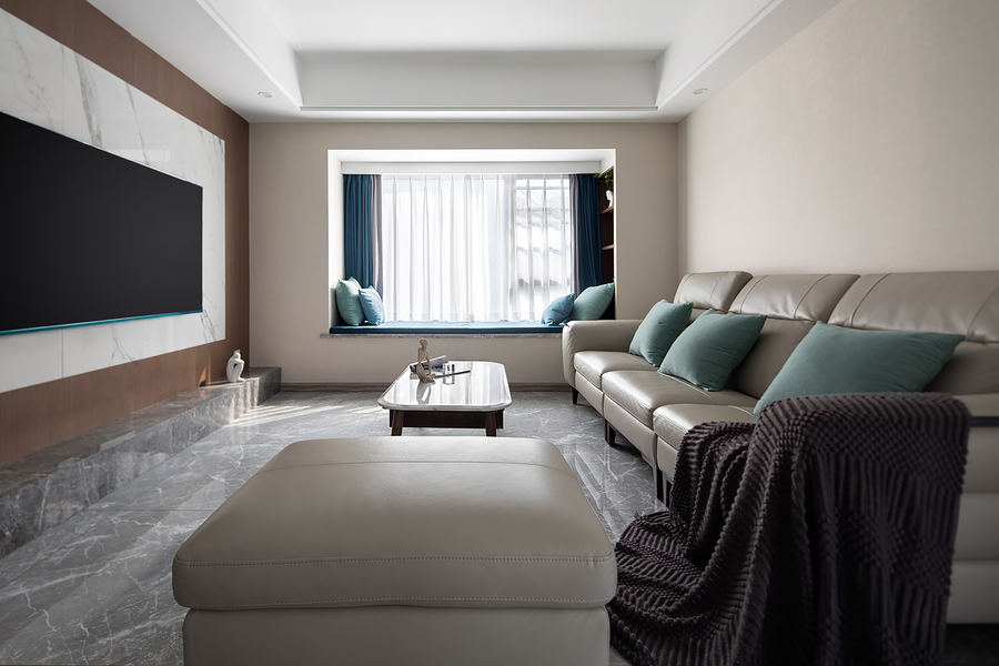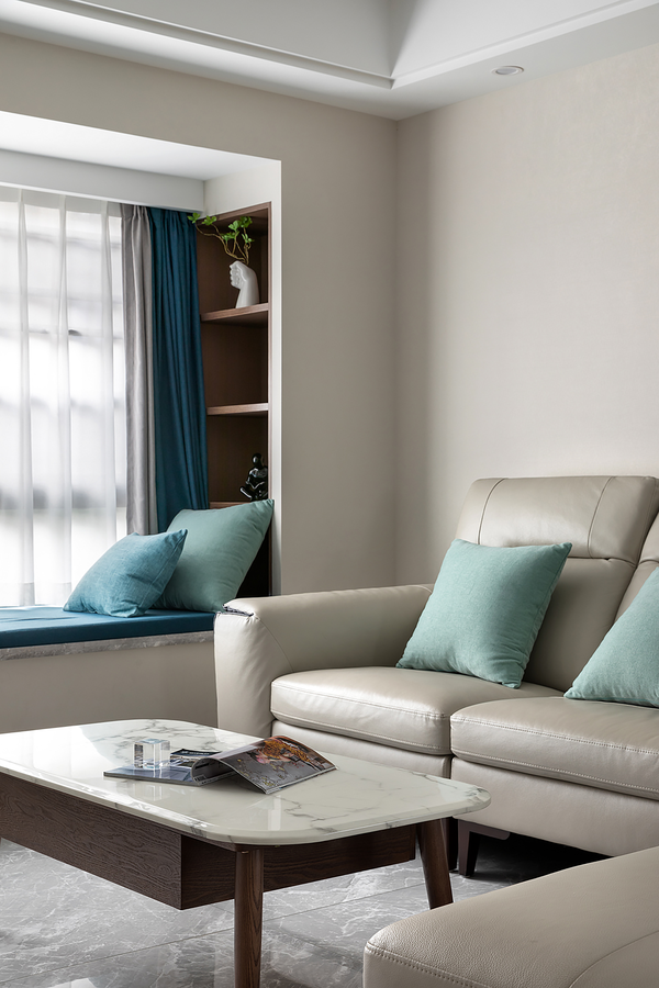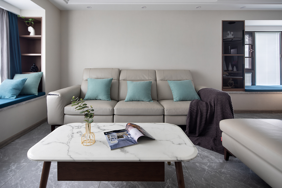 阳台透过落地窗融入客厅,保证了屋内充足的采光,整个空间内的软装设计偏简约大气,浅灰色的皮质沙发优雅禅意,小巧的岩板茶几,不经意布置的绿植,随意翻开的杂志,几缕跳跃的阳光,充斥着主人对生活无比的赤城,温馨舒适。