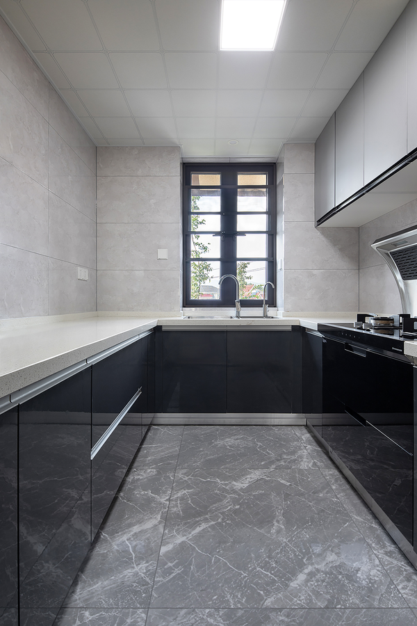 U型厨房同样延续黑白灰风格,上下橱柜大大增加储物空间,水槽、洗碗机、蒸烤箱等一应俱全,方便日常烹饪备餐。