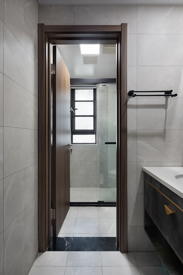 卫生间选择黑白褐三色搭配,简单纯粹,墙面和地面满铺灰色地砖,耐脏好打理,干湿分离是实用主义的首选。