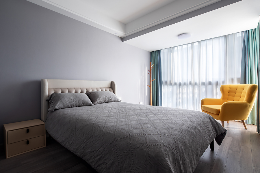 老人房背景墙选了高级灰,沉稳低调,搭配黑色皮质奶咖色,阳光照射的地方摆放了一张姜黄色单椅,素雅中透出一丝活泼,留给主人享受独处时光。