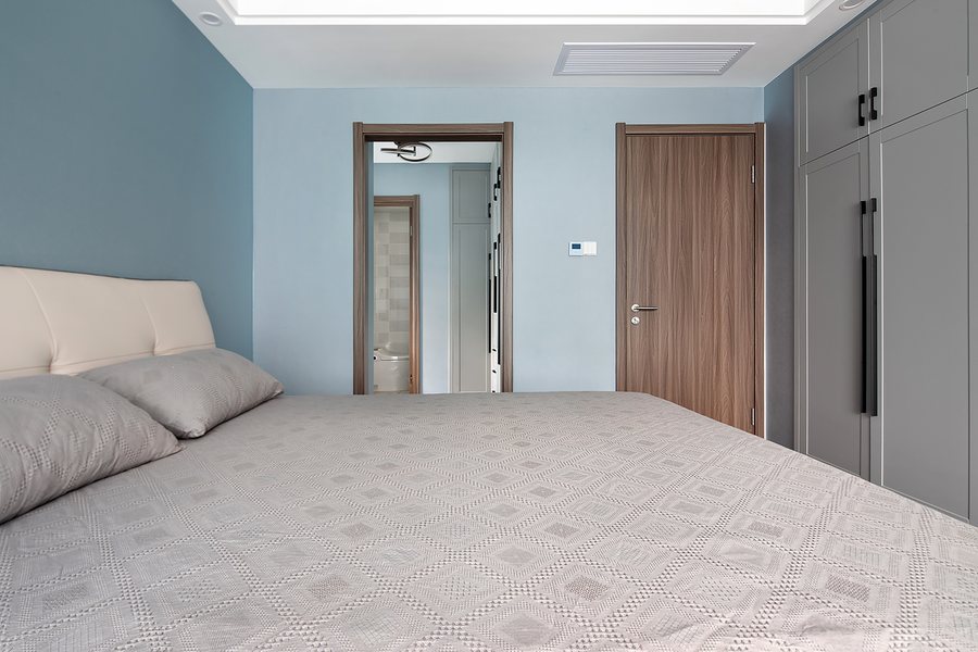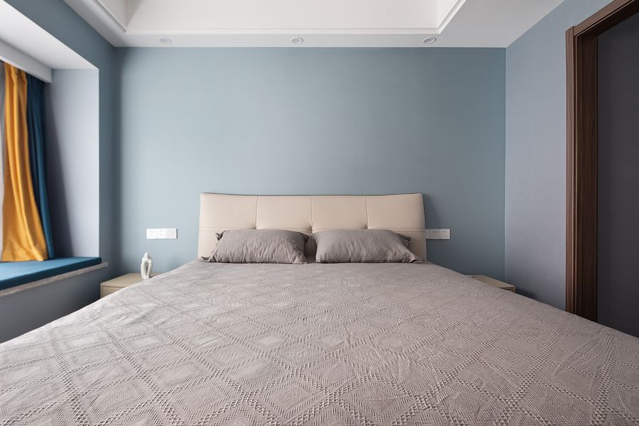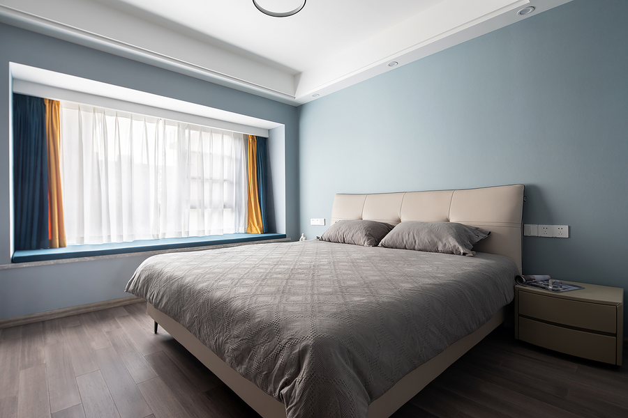 静谧蓝通涂墙面,给人以大海般的平静浪漫,配上自然的原木地板,空间内瞬间有了温度,同样软装的选择上也去繁留简,没有过多的造型和拖沓的软装,太阳光穿透窗帘且洒落一室,带来明净、宽敞的空间感。