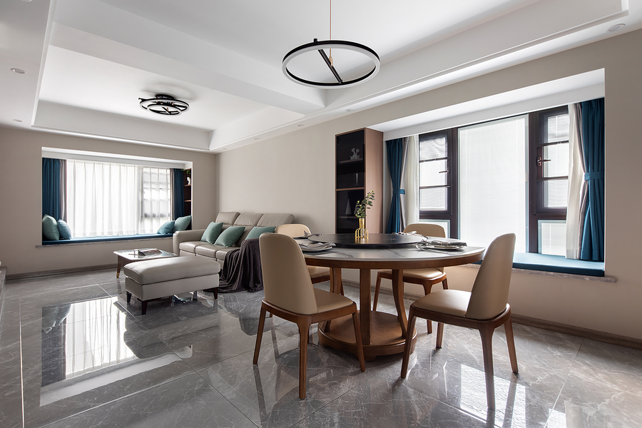 颜色浓度和谐整体的木质和蓝白相间的窗帘让空间质感更加丰富,整个空间的软装克制而高级,咖色实木圆桌搭配四把同类型的餐桌椅,颜色沉稳时尚,蔓延着主人的文艺情怀。