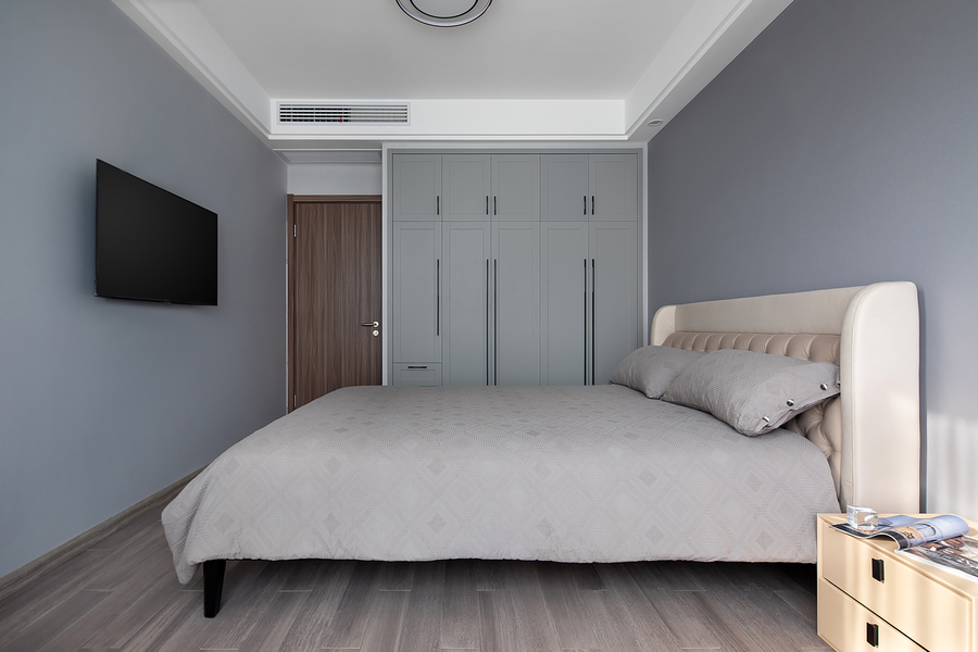 与床头同类型的皮质床头柜上时尚简约,干净利落又不失家的温馨感,柜面上摆放着昨晚睡前随手翻阅的书籍,角角落落都是生活的气息。