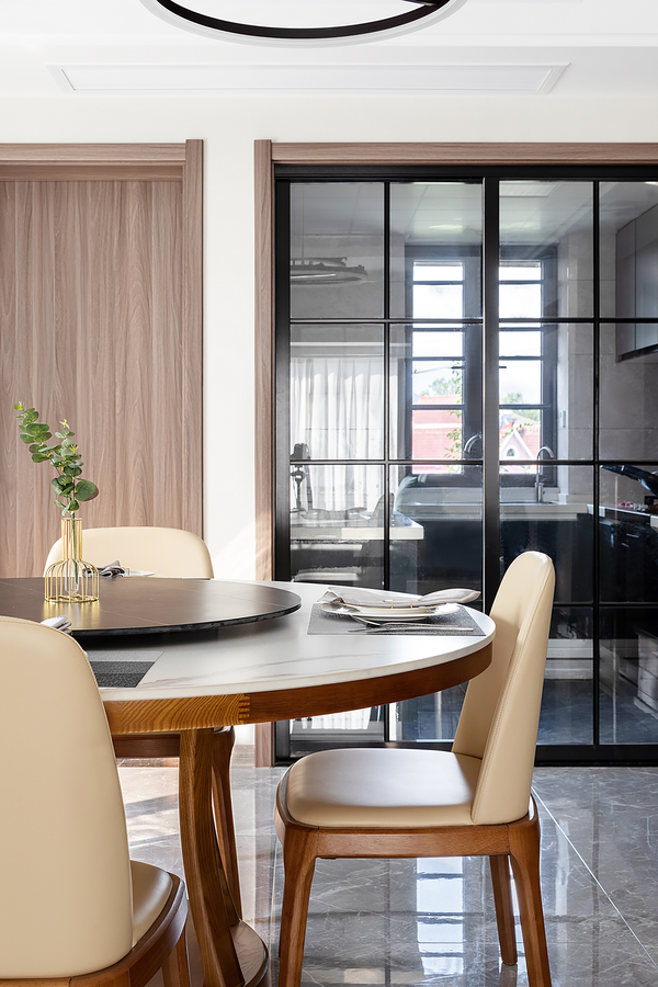 餐厅与客厅保持相近配色,整体搭配很和谐,餐厅背景墙以卡座的形式呈现,打造出轻松愉悦的生活状态,灯、桌、椅、餐边柜、素雅的墙壁,构成含蓄而内敛、简单而安闲的餐厅环境。
