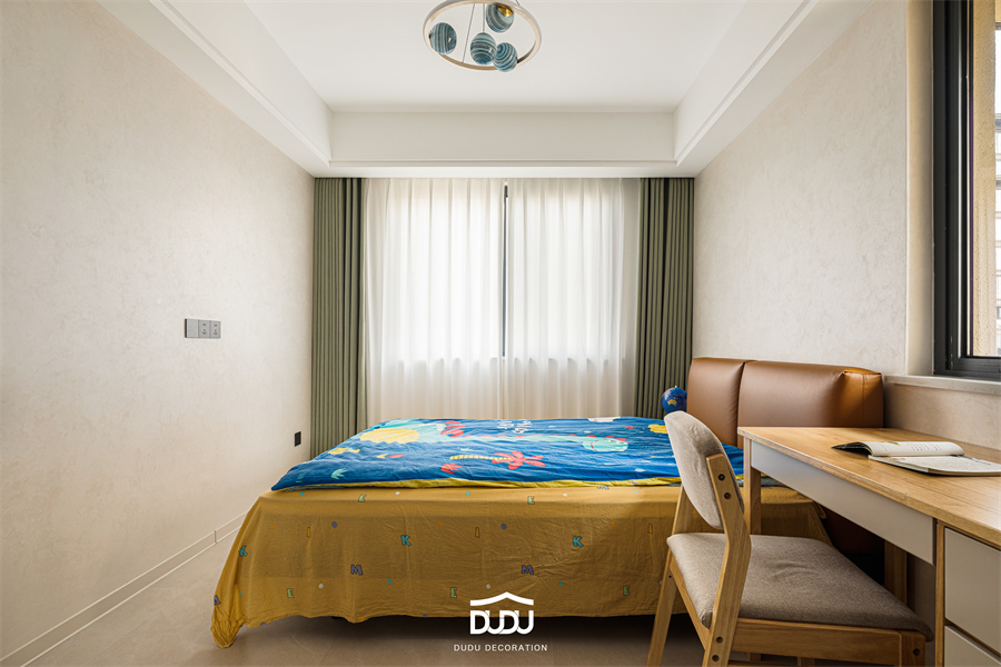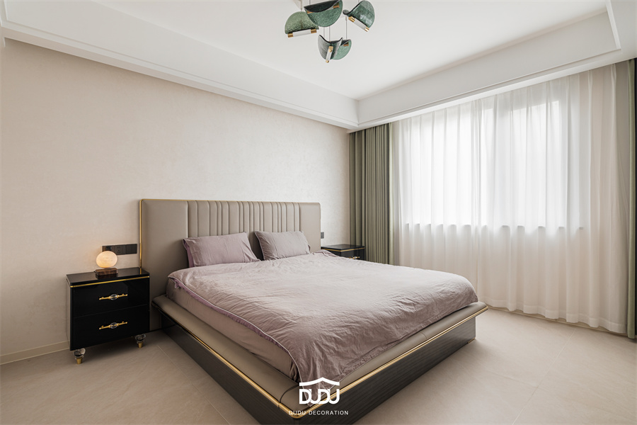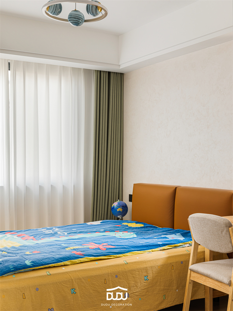 首先映入眼帘的便是占据整面墙的大面积落地窗,轻薄的白色纱帘随风轻拂,让自然光毫无保留地倾泻而入,瞬间点亮整个空间。窗外的景色宛如一幅流动的画卷,与室内的温馨氛围相互交融。