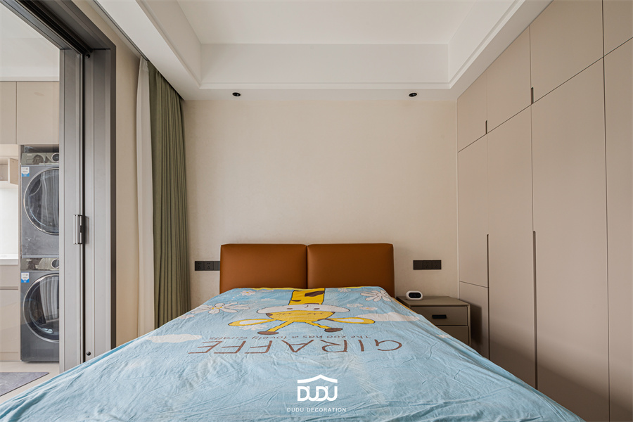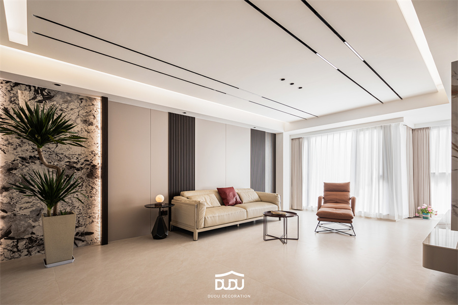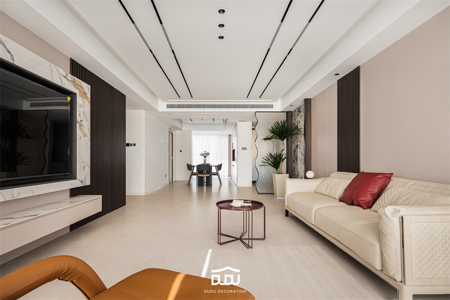 客厅摒弃了传统的主灯设计,整个空间通过巧妙布局的辅助灯光营造出温馨又富有格调的氛围。天花板上,嵌入式筒灯均匀分布,散发出柔和而均匀的光线,照亮整个空间;隐藏在吊顶四周的灯带,发出暖黄色的光晕,为空间勾勒出灵动的轮廓,增添温馨之感。