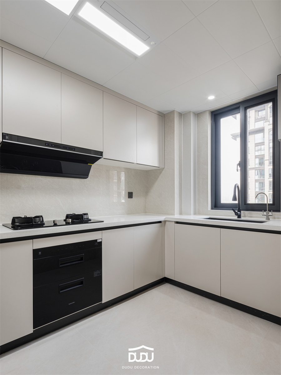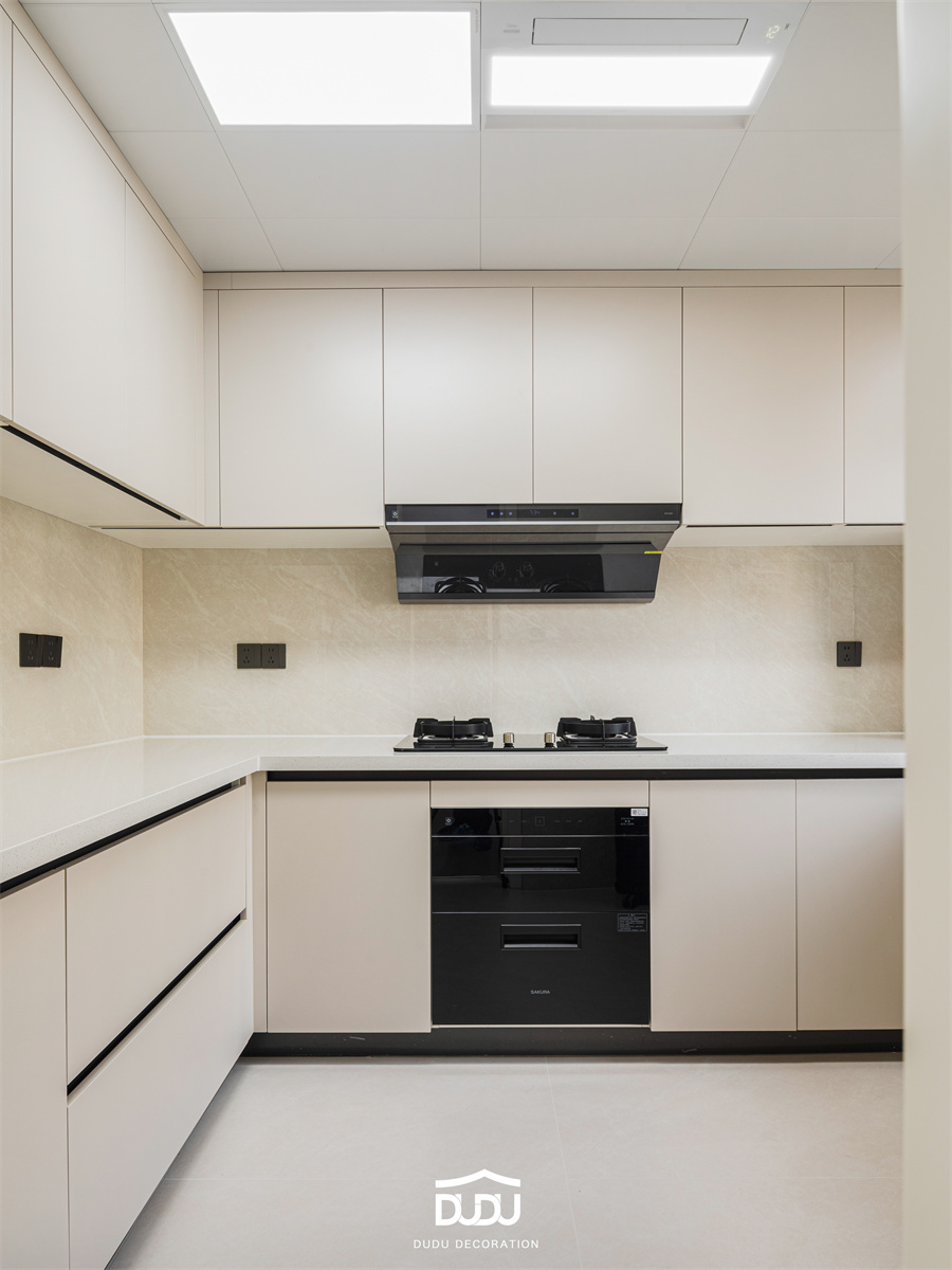 橱柜采用米白色的平板式门板,简洁的线条没有一丝多余的装饰,拉手选用隐藏式设计,不仅使整体外观更加流畅统一,还避免了日常磕碰,同时也完美契合现代风追求简约的理念。