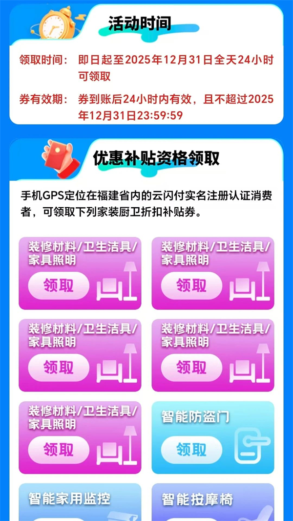 包含床架、床垫、桌椅、按摩椅、沙发、智能门锁、智能坐便器、智能马桶盖等家居用品,补贴15%