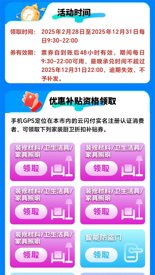 购买装修材料、卫生洁具、家具照明等三大类产品每人单笔消费最高补贴2000元,累计不超过10000元;购买智能家居类项下产品每人每个具体类别可享受1次补贴,最高2000元
