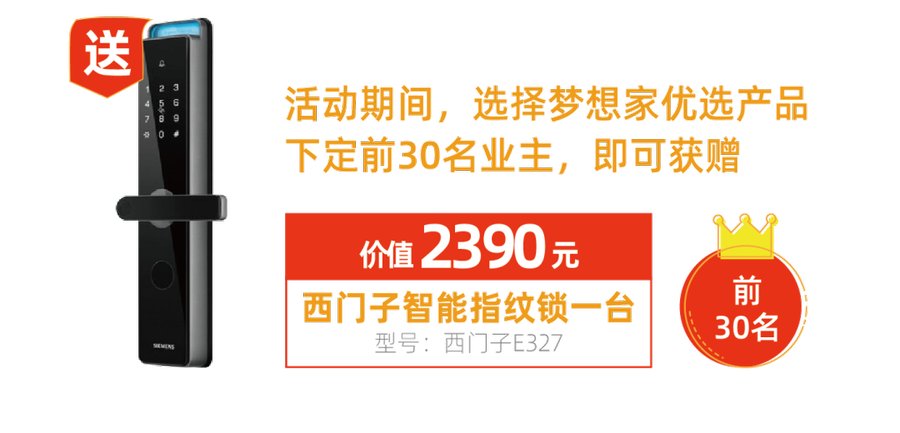 活动期间,选择梦想家优选产品下定前30名业主,即可获赠价值2390元的西门子智能指纹锁一台。