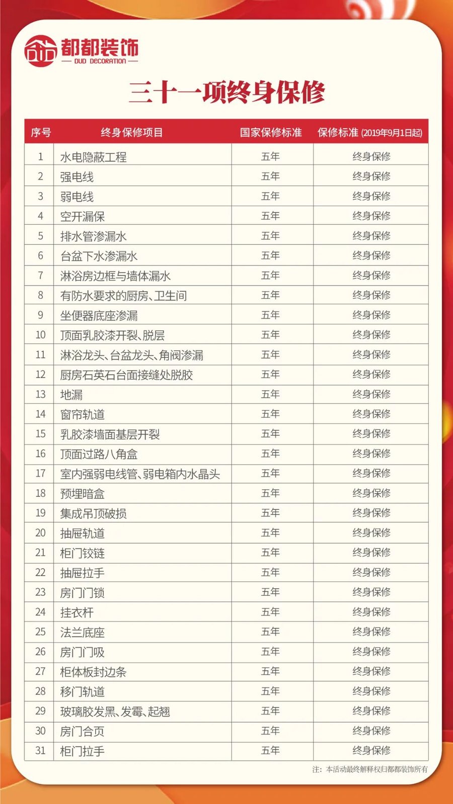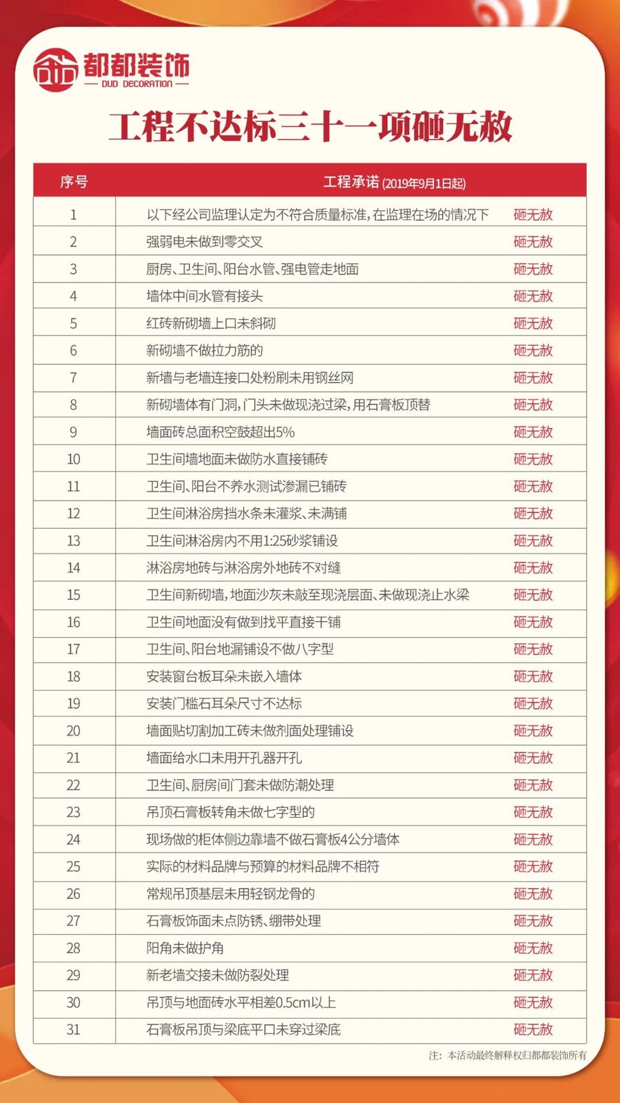 都都装饰严格按照第六代标准工艺规范执行,八大透明服务体系,31项质量检测不达标砸无赦,31项终生保修,每一道工艺都做到精益求精。每周五工地大巡查,严格把控工地品质!