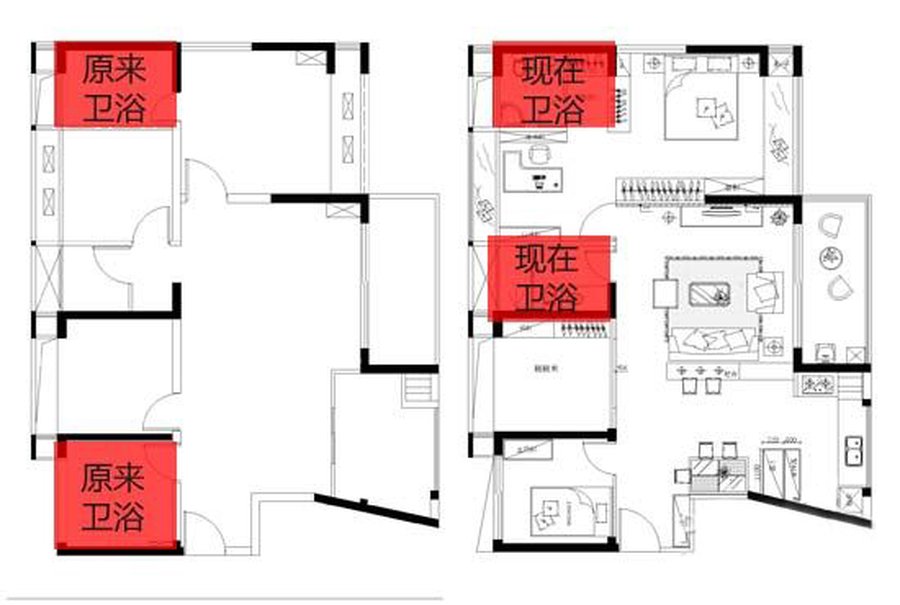 因为空间规划的问题,不少人喜欢在装修规划时更改卫浴位置,增加可用空间。如果要更改卫浴位置,要优先考虑管道和排水系统,特别是座便器的排污管道迁移,涉及到地面垫高产生载重和防水问题。所以一般不建议随意更改卫浴间的位置。
