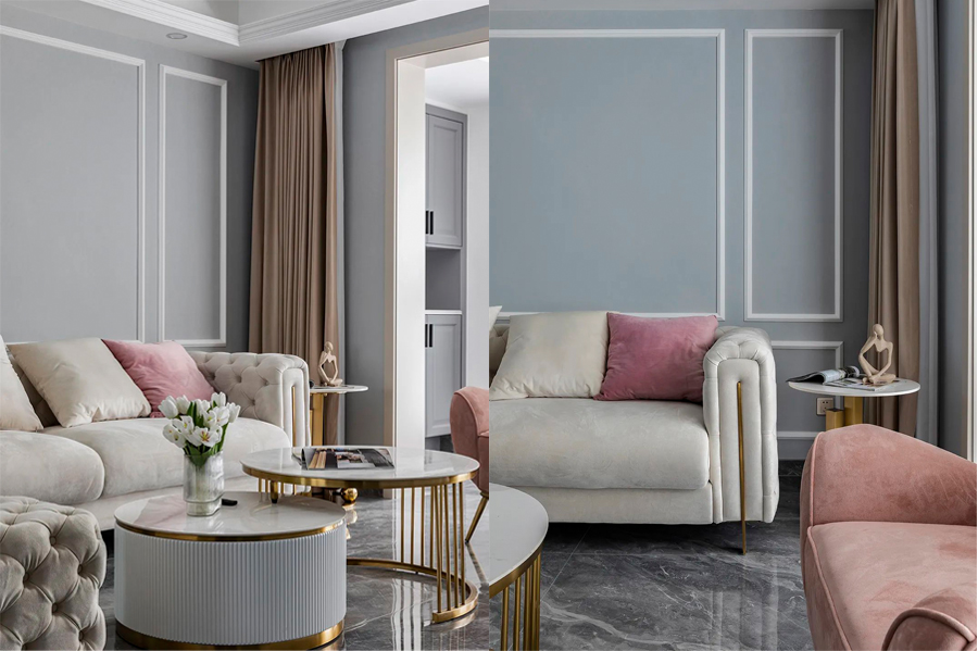 浅灰色的墙壁用白色石膏线勾勒出矩形轮廓,奶白色的沙发上,用玫瑰粉色的抱枕点缀,白色镶金色边的组合茶几和香槟色的布帘则透露出几分轻奢感。