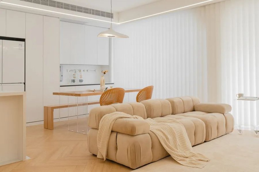 这套案例中运用白色的纱帘和柜子作为背景色,适当运用奶茶色和米白色的布艺和织物实现肌理感,搭配木地板和原木餐桌及透明亚克力配件,空间整体显得时尚又有质感。