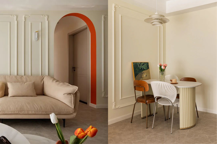 在这个案例中,橙色作为点缀色,出现在客厅的配色和拱形门中。