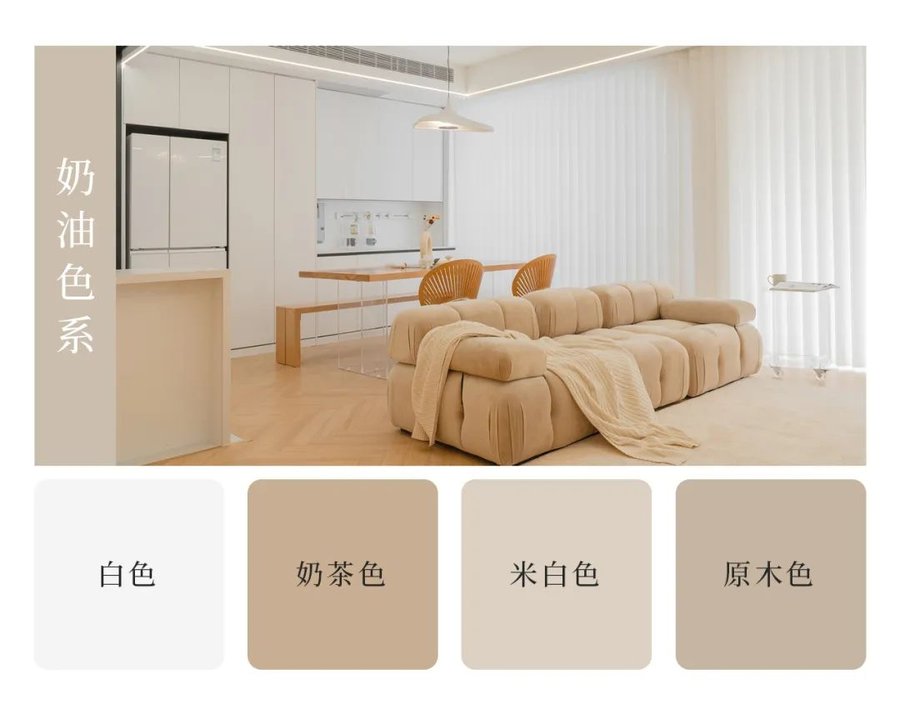 奶油风是一个广义的概念,奶油风的色系包括从白到奶咖之间的所有颜色,包括奶白色、奶茶色等等,但是在装修时,空间的主色调却不宜过多。