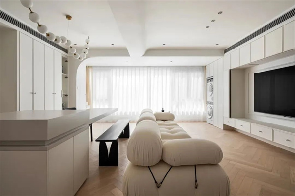配色比较单一这种情况,很可能会发生在这两年比价流行的奶油风的装修上,因为追求极致的干净通透,很多人在整个空间只选用一种或两种色彩。