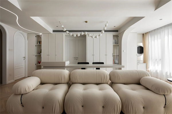 选沙发之前建议先良好客厅尺寸,沙发与茶几之间至少预留45cm的通行通道,小户型建议选一字型三人位沙发,客厅空间较大可以选择L型或U型围合式沙发。