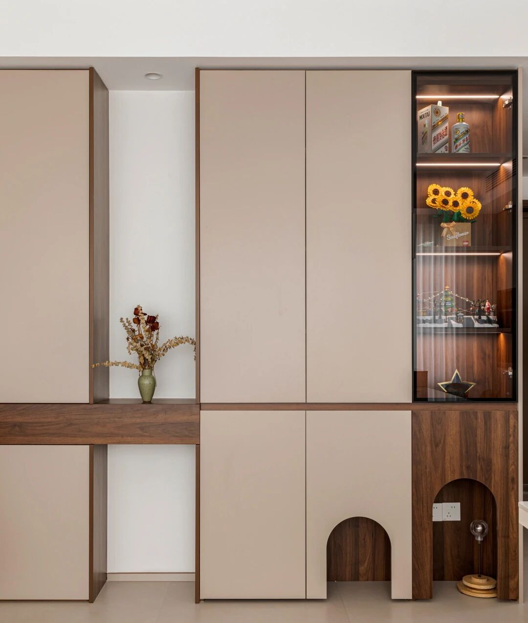 鱼缸嵌入定制柜 可养宠可观景 养鱼或养龟的家庭,可以考虑将鱼缸嵌入定制柜一角。 根据鱼缸尺寸提前预留柜体位置,将水体与造景融入整面墙的收纳系统中,不仅节省空间,更让这一角成为家中天然的视觉焦点。