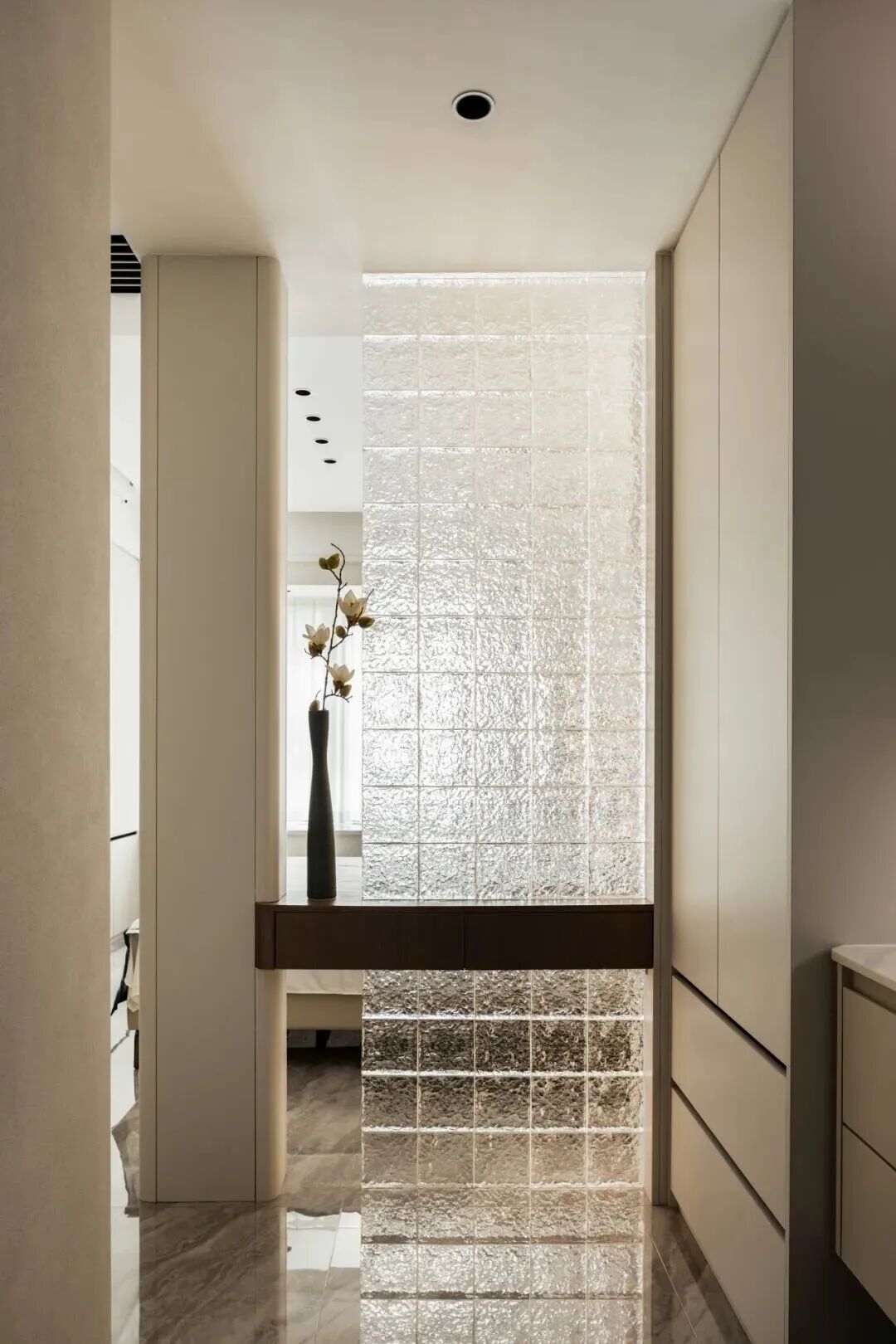 做好收纳设计,将大部分杂物用柜门挡起来,保持台面“空无一物”,能让空间更显整洁通透。