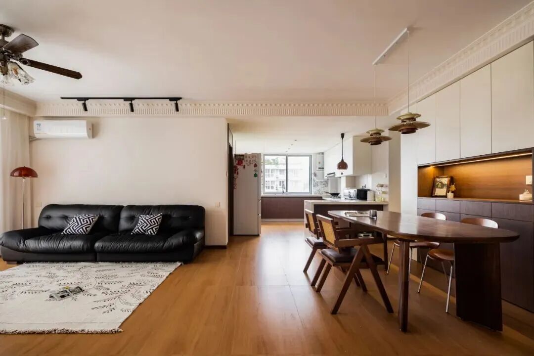 比如说打掉客餐厨阳台之间的非承重墙,瓷砖通铺,将几个空间融合在一起,消除视线阻隔。